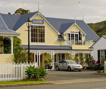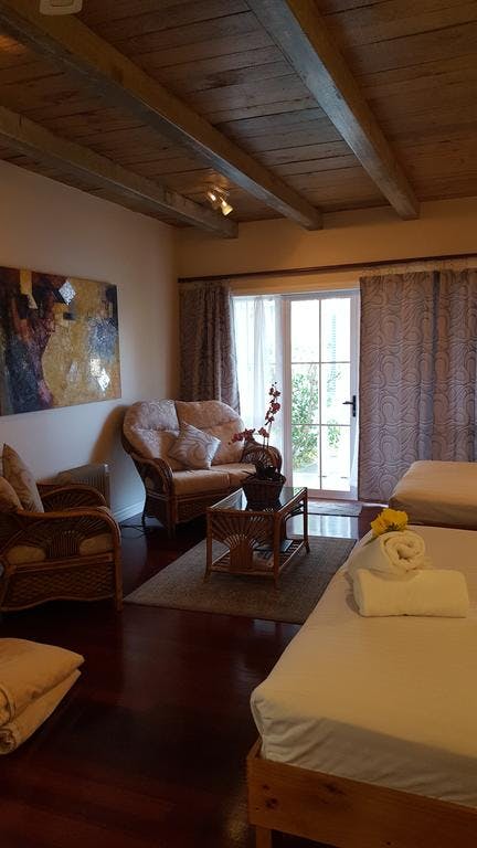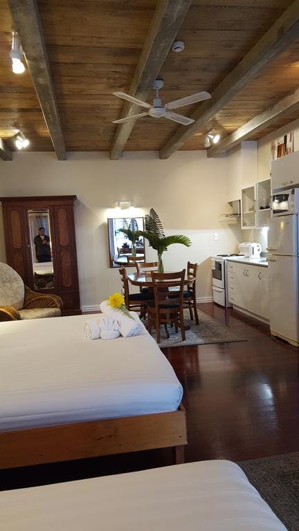 This Suite is on the ground level, has a king and a queen bed, en suite and fully self - contained and self catering. Open plan with a small lounge area and kitchenette with electric stove/oven, full fridge/freezer, microwave and a four seater dinning table. Jute rug on quila hard wooden floors with french doors opening out onto the veranda and outdoor furniture. This unit is the only suite with wheelchair excess. The suite is south west facing over looking the open car-park area surrounded with lush and manicured sub-tropical garden with Russell Reserve Hill in view.